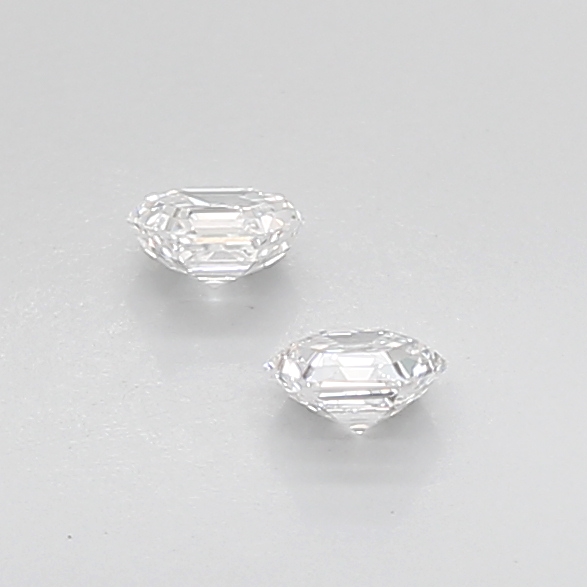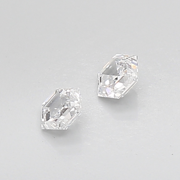 Each diamond is crafted in a hexagonal shape with step-cut facets, defined by precise lines and a sleek hall-of-mirrors effect that emphasizes symmetry and clarity over overt sparkle. Measuring 4.00 mm in length, 3.50 mm in width, and 2.05 mm in height, these diamonds present excellent proportions that enhance their geometric presence despite their petite scale.
