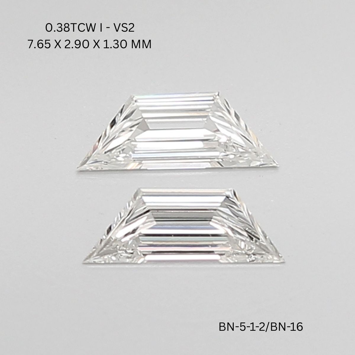 Expertly cut in a trapezoid shape, each diamond measures 7.65 mm in length, 2.90 mm in width, and 1.30 mm in height, presenting an elongated silhouette with clean, structured geometry. Their precise symmetry and sharp step facets make them ideal as side stones, paired accents, or complementary settings that elevate the elegance of any bespoke jewelry design.