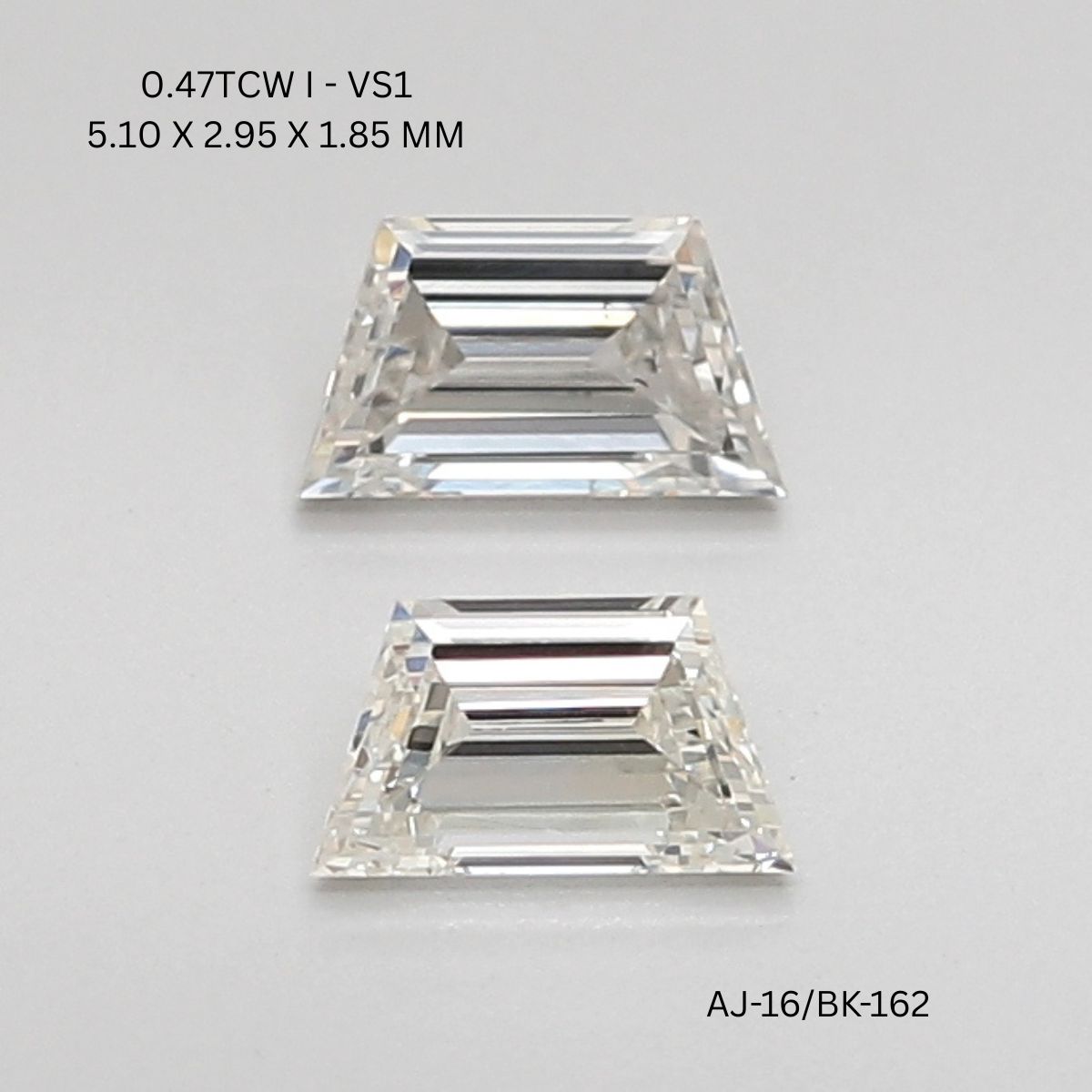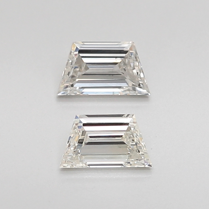 With a combined weight of 0.47 carats, each diamond is carefully matched and proportioned, measuring 5.10 mm in length, 2.95 mm in width, and 1.85 mm in height. The classic trapezoid shape delivers clean architectural lines and visual balance, making this pair ideal for elegant side stones in engagement rings, precision-set earrings, or bespoke fine-jewelry creations where proportion and harmony are essential.