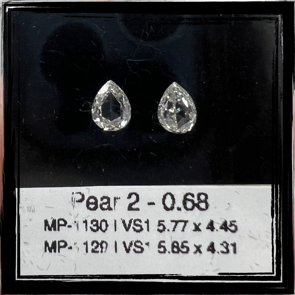 Gracefully romantic and delicately luminous, this natural pear-shaped rose-cut diamond pair from OM Jewels Inc captures the essence of timeless beauty and refined craftsmanship. With a combined carat weight of 0.68 carats, these diamonds are carefully matched to achieve elegant symmetry, making them ideal for designs that celebrate softness, movement, and understated luxury.