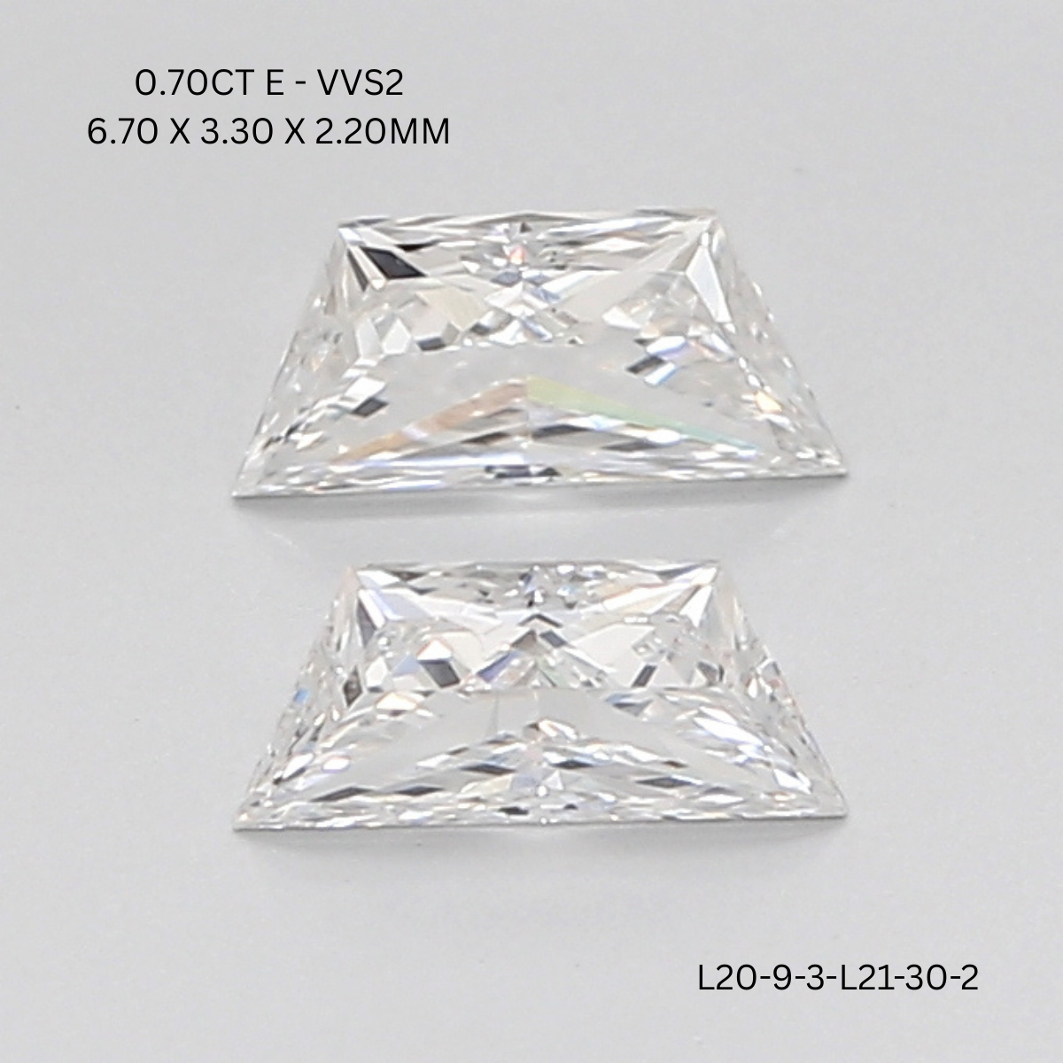 With a combined weight of 0.70 carats, each diamond is meticulously proportioned and perfectly paired, measuring 6.70 mm in length, 3.30 mm in width, and 2.20 mm in height. The classic trapezoid shape offers strong architectural balance and versatility, making this pair an ideal choice for refined side stones in engagement rings, elegant earrings, or bespoke fine-jewelry creations where symmetry is essential.