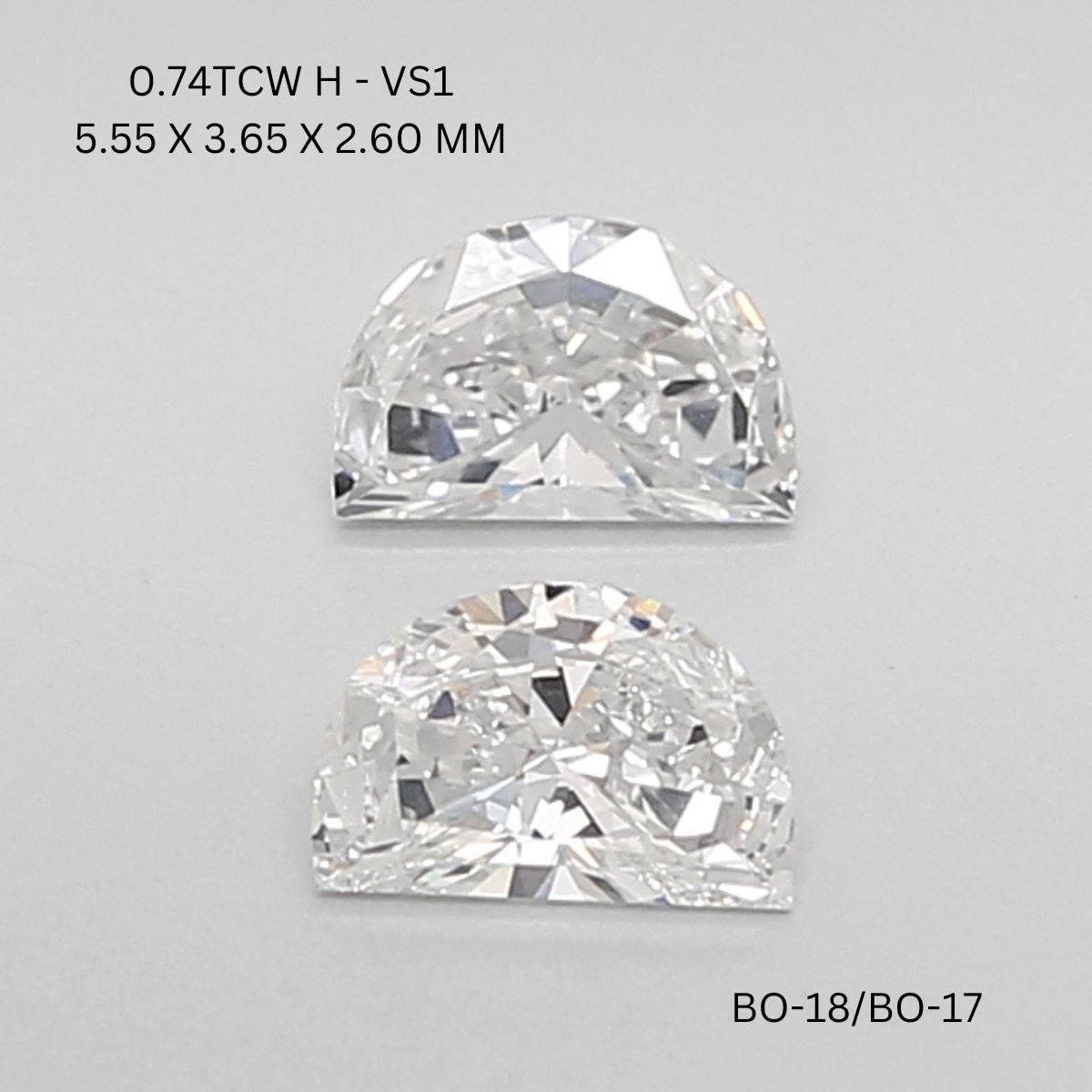 This Natural Pairs Inventory showcases a total carat weight of 0.74 carats, with both diamonds precisely matched to ensure consistent shape, proportion, and light performance. The Brilliant cut enhances the natural beauty of the Half Moon shape, allowing the diamonds to reflect exceptional fire and sparkle while complementing center stones with graceful curvature and balance.
