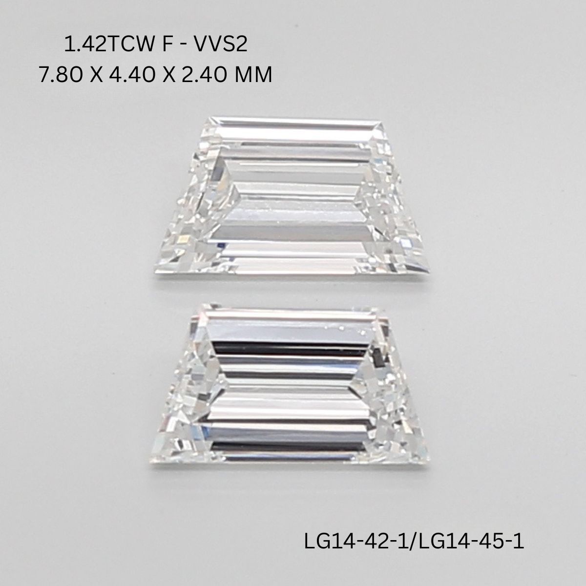Elevate your jewelry designs with OM Jewels Inc?s lab-grown step-cut trapezoid diamond pairs, crafted for precision, elegance, and refined brilliance. Each diamond in this pair features a carat weight of 1.42, making them perfect for accenting larger center stones, creating bespoke rings, or designing statement jewelry pieces. With a VVS2 clarity, these diamonds offer excellent transparency with minimal inclusions, ensuring a flawless and captivating sparkle.