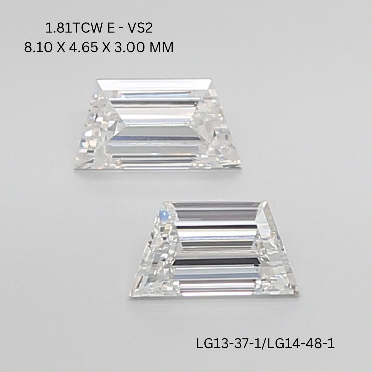 With a total carat weight of 1.81, each diamond is cut in a defined Step Cut, emphasizing strong linear facets and crisp symmetry. Measuring 8.10 ? 4.65 mm with a height of 3.00 mm, the proportions create a substantial, structured look that feels powerful yet refined. The trapezoid shape offers clean angles and visual stability, making these stones ideal for framing center diamonds or anchoring contemporary designs.