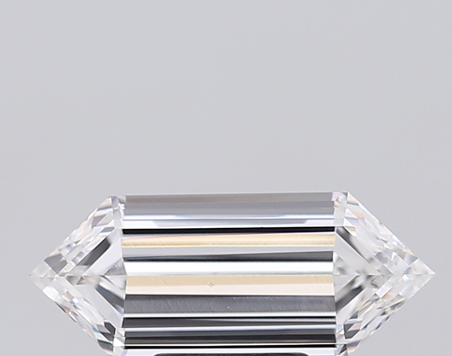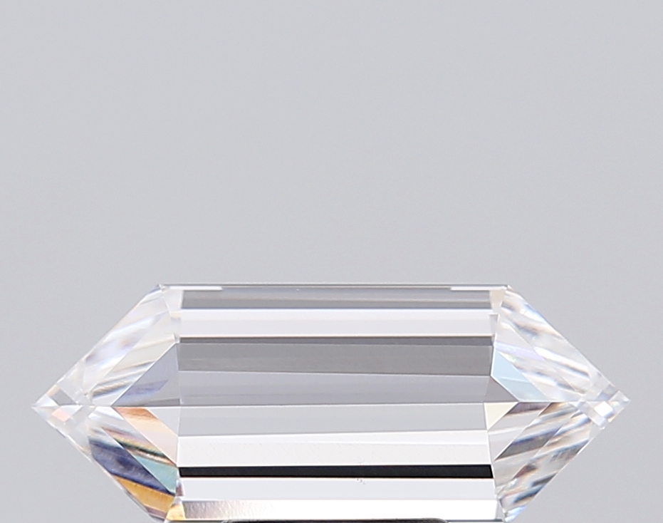 Lab-grown E-color hexagonal diamond with elongated step-cut elegance.